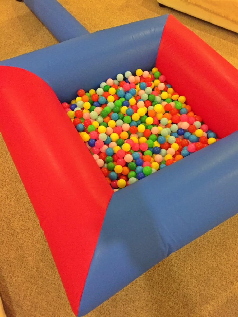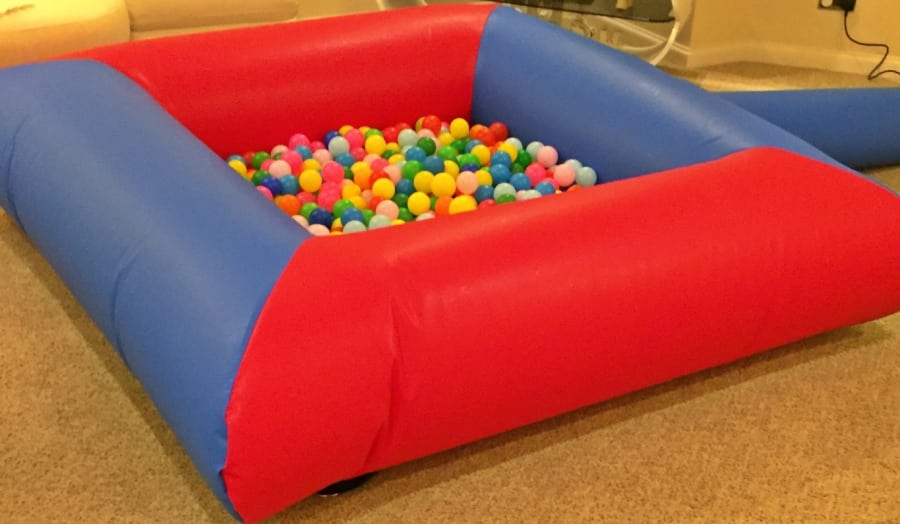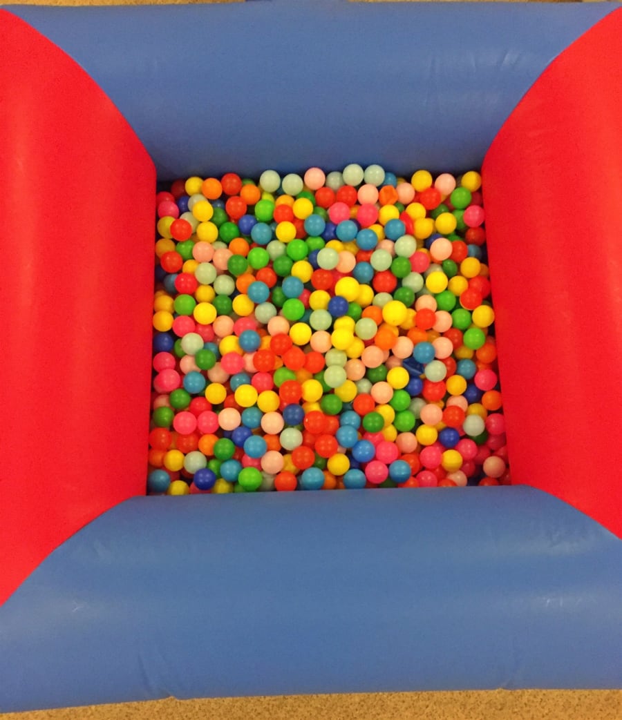 This is our blue and red ball pond. It is 6ftx6ft, the perfect size for the younger kids.